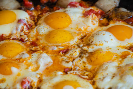 Shakshuka with meat, eggs and vegetables. Shakshuka is a traditional dish of Jewish cuisine