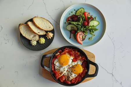 Tasty Shakshouka served on white marble table, flat lay