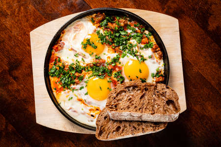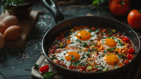 Shakshuka with fried eggs, tomatoes and parsley in frying pan