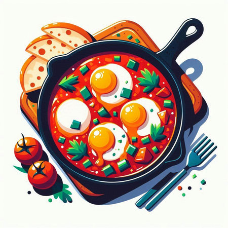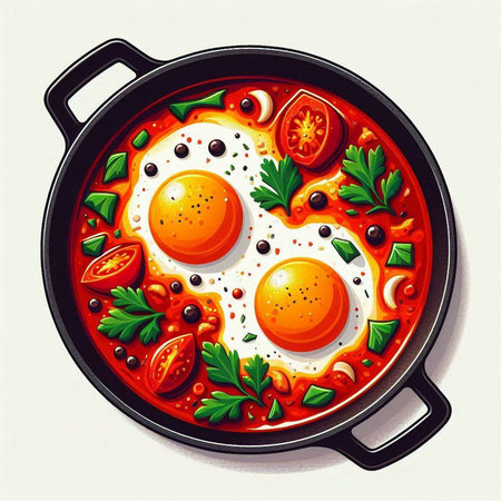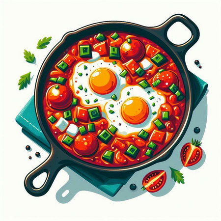 Colorful Shakshuka in frying pan. Cuisine lunch. Generate Ai