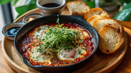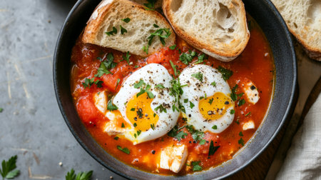 A mouthwatering shakshuka featuring perfectly poached eggs nestled in a rich tomato sauce, garnished with fresh herbs and accompanied by toasted bread.