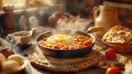 A steaming skillet showcases a delicious meal featuring eggs and tomatoes in a cozy kitchen. The soft light and rustic elements create a warm atmosphere perfect for any dining occasion.