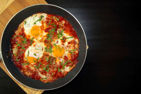 Shakshuka , middle eastern traditional homemade breakfast- fried eggs, onion, bell pepper, tomatoes and parsley in a pan on a dark background