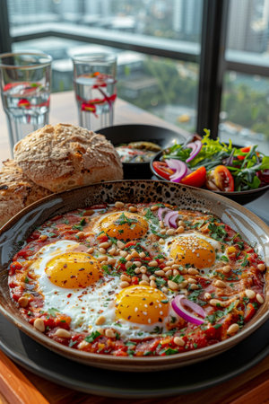 Enjoy a delicious Rustic Shakshuka with Grilled Bread in a modern and cozy setting