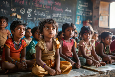 Diverse group of young children sitting attentively in a classroom with a blackboard background
