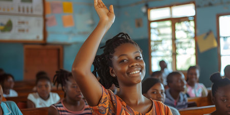 African student raising hand in classroom surrounded by classmates smiling and engaged in learning. Concept Education, Diversity, Classroom, Student Engagement, Learning Environment