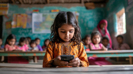A 12-year-old girl sits and plays on her phone during class. In the background.