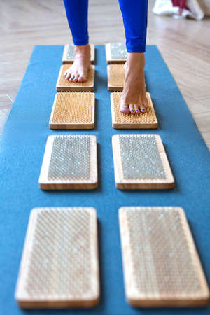 Vertical photo of a woman walking on a board with sharp nails over white background. Sadhus board - practice yoga.