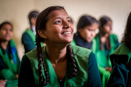 Uttar Pradesh. 05-15-2018. Girl smiling at school. Children has the opportunity of receiving proper quality education deprive for many child that has to work to support financially their families.