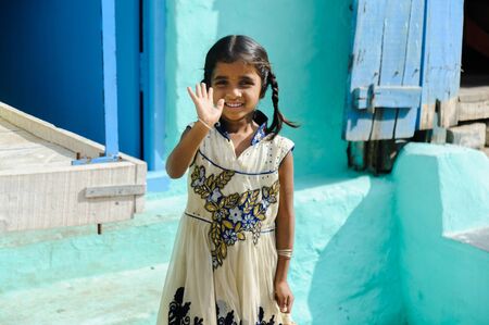 PUDUCHERY, INDIA - DECEMBER Circa, 2018. Portrait of unidentified handsome cute smiling indian girl outdoors. Concept of joyful even if they are poor people.