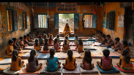 A young girl sits cross-legged on a patterned mat with her hands pressed together in a gesture of prayer. She wears vibrant clothing and has long, curly hair. The atmosphere around her is calm, filled with other children engaged in meditation.
