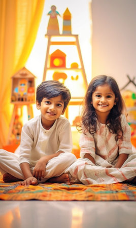 Generative AI : happy kids friends brother and sister at home