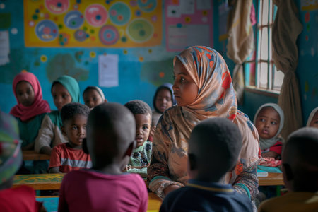Female teacher in a hijab engaging with diverse young students in a colorful classroom