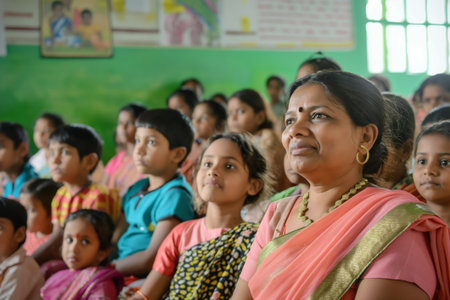Smiling Indian mother with her child attentively participating in a parent-teacher meeting