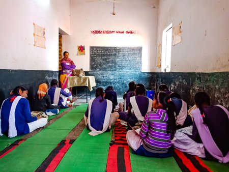 DISTRICT KATNI, INDIA - JANUARY 21, 2020: Indian government school female students seating on floor together at classroom.
