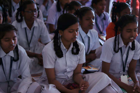 PUTTAPARTHI, ANDHRA PRADESH, INDIA - JULY 9, 2017: Group of indian schoolgirls.