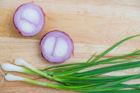 Slice shallot on wooden background, top view image shallot, green onion on wooden,