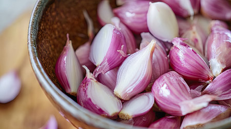 A close-up view of fresh shallots arranged in a rustic bowl, showcasing their vibrant colors and textures, perfect for adding flavor to various dishes.