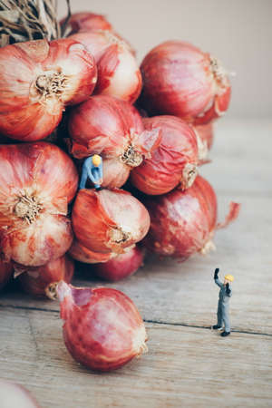 miniature people : worker working with onion