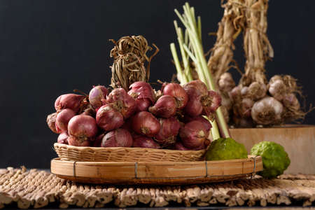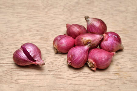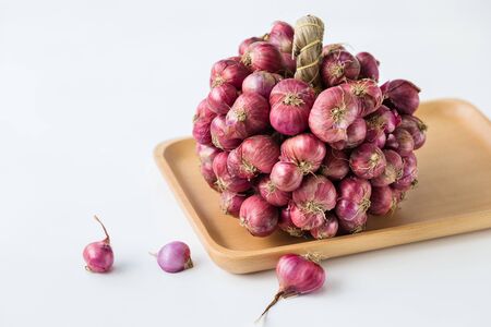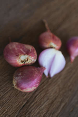 red onion or Shallots. shallots on wooden plate with . Selected focus. Concept of spices in healthy cooking