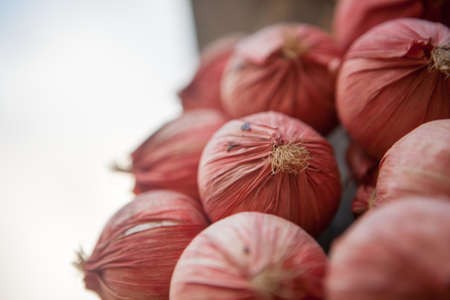 Close up of red onion on display at the market, Kuningan, Indonesia.