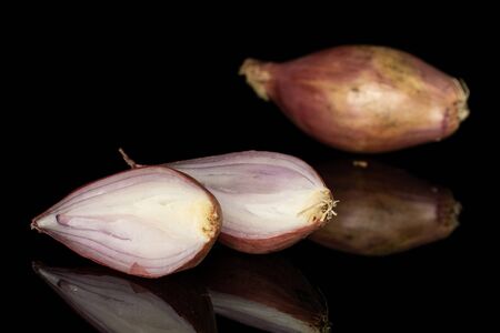 Group of one whole two halves of fresh brown shallot isolated on black glass