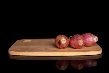 Group of three whole shallot on bamboo cutting board on black glass