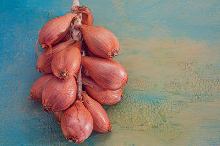Onions. Shallots tied in bunches on a green wooden old surface or table. Shallow depth of field. Art image of a shallot.