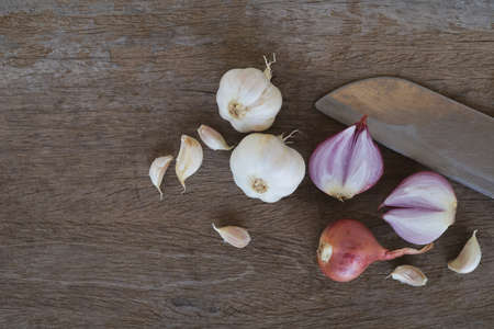 Onion and garlic for cooking on old wooden background