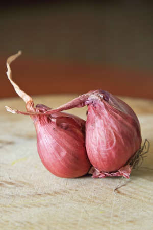 Shallots. Fresh purple shallots on wooden board. Shallots close up.