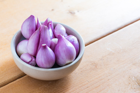 Shallots in white bowl over wooden background