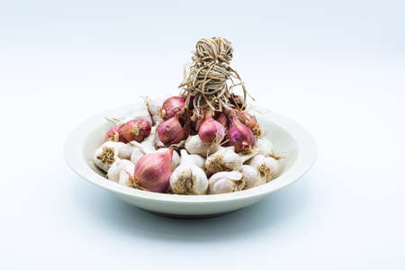 lot of garlic and red onion in the plate isolated on white background
