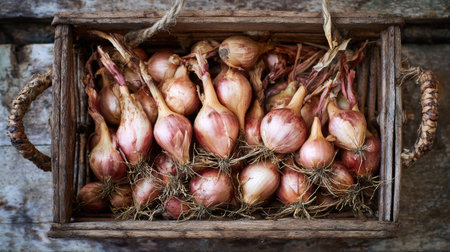 A beautiful arrangement of freshly harvested shallots in a rustic wooden crate. This image captures the essence of organic farming and healthy cooking.