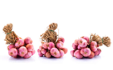 Close up a small group of organic shallot on white background, front view image shallots, or red onions.