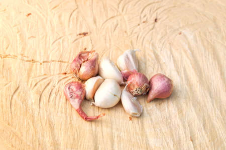 Red onions and garlic vegetable on wood background