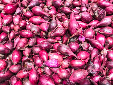Stack of Shallot on fresh food ingredient market. Shallot is raw ingredient for seasoning the food