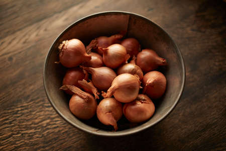 Overhead view of fresh whole shallots in bowl