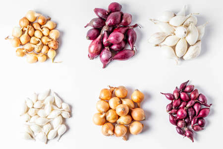 Shallot onions in a group on white background.