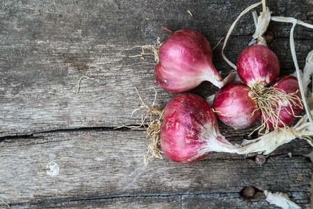 Red onions on old wooden background. Top view with copy space.