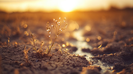 A solitary plant stands resiliently in cracked soil, illuminated by the warm glow of sunset, capturing the beauty and fragility of nature in a serene landscape.