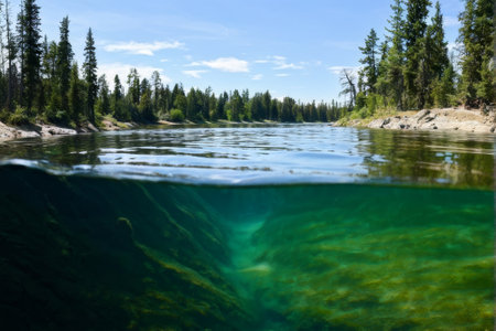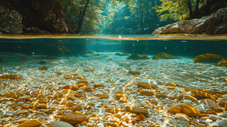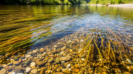 clean river with fish visible beneath the clear water, created with generative ai