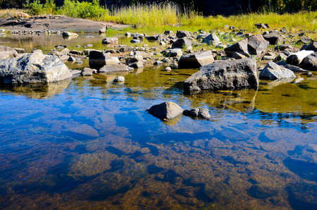 Irregular stones in the shallow water of riverside with sky reflection