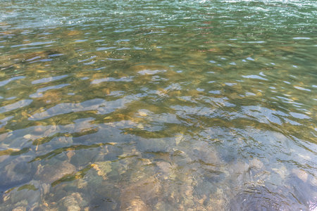 Beach pebbles under clear water at sunny day