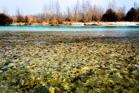 River coast with stones and pebbles on sunny day