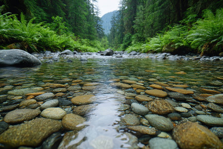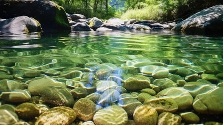 Tranquil river reflectively mirrors smooth stones amidst lush greenery