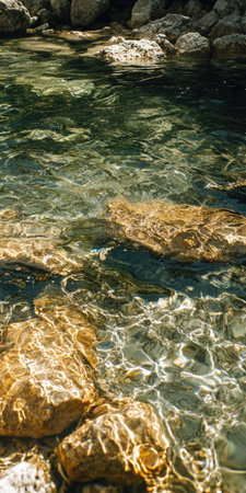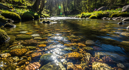 Close-up of clear water flowing gently over smooth stones in a serene stream, with sunlight glistening on the surface