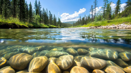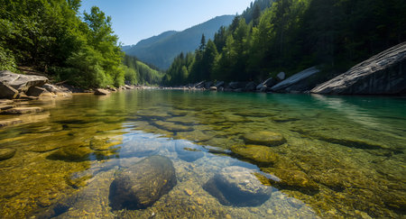 A serene river flows gently over smooth stones, surrounded by lush green trees and majestic mountains, showcasing nature