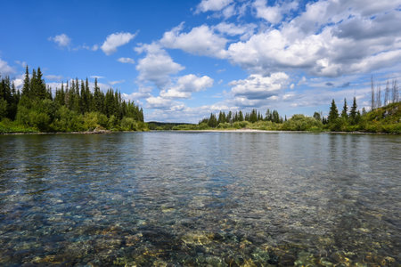 On the taiga river. Summer water landscape in the northern forests.