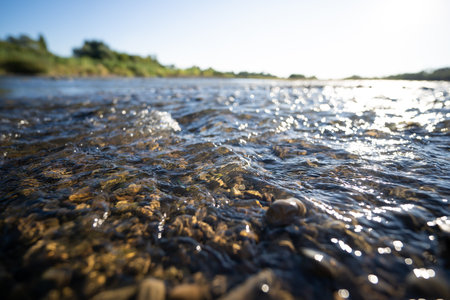 Cool morning light captures the gentle flow of a river as it glides over a bed of polished stones, creating a tranquil scene. Nature's peaceful embrace invites quiet reflection.