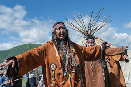 PETROPAVLOVSK CITY, KAMCHATKA PENINSULA, RUSSIA - JULY 11, 2015: Women in national clothing aborigine of Kamchatka expression dancing. Public concert national folklore dance group on Fishermans Day